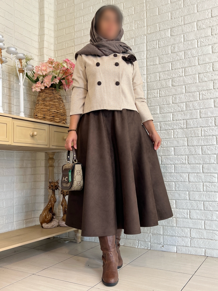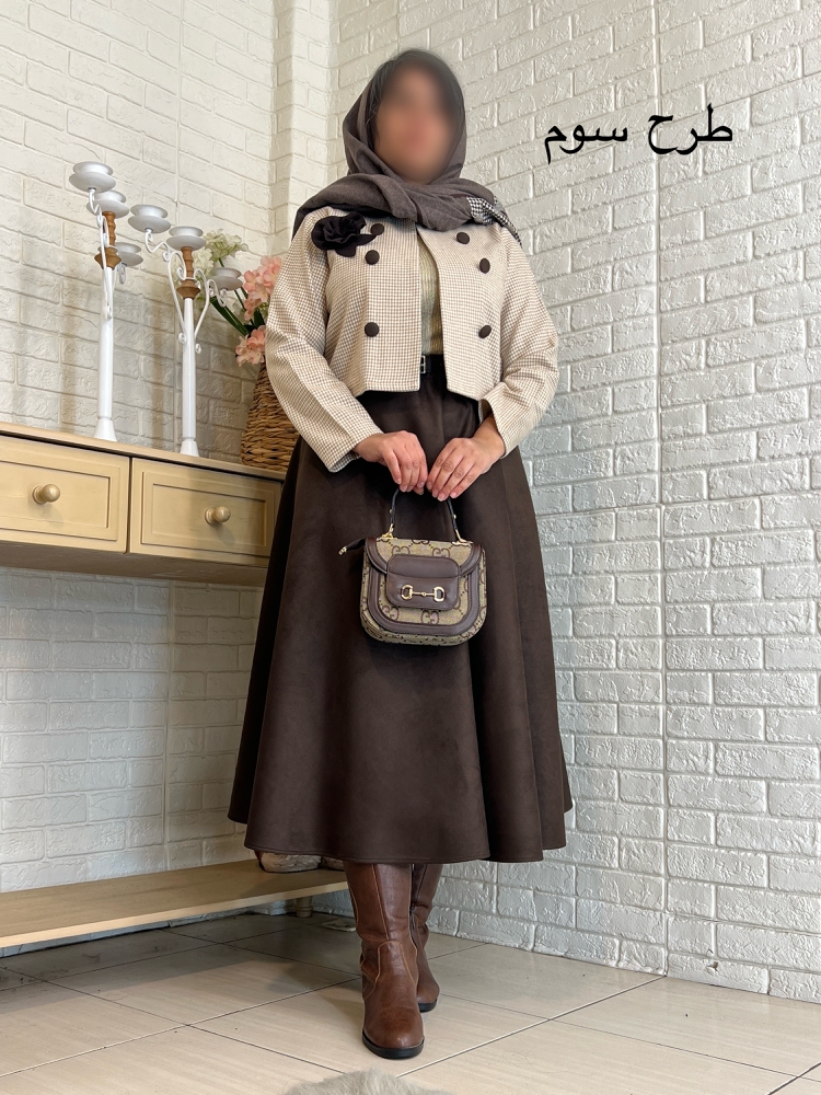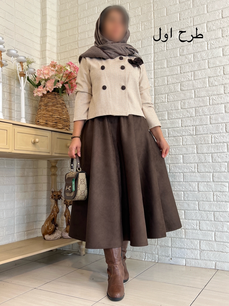 جنس پارچه کت پشمی قد ۵٠-۵۵ فری تا ۴۴-۴۶ دور سینه تا ١١٠ قابلیت جابجایی دکمه تا ٧ سانت قد دامن ٩٠ جنس سوییت جیر